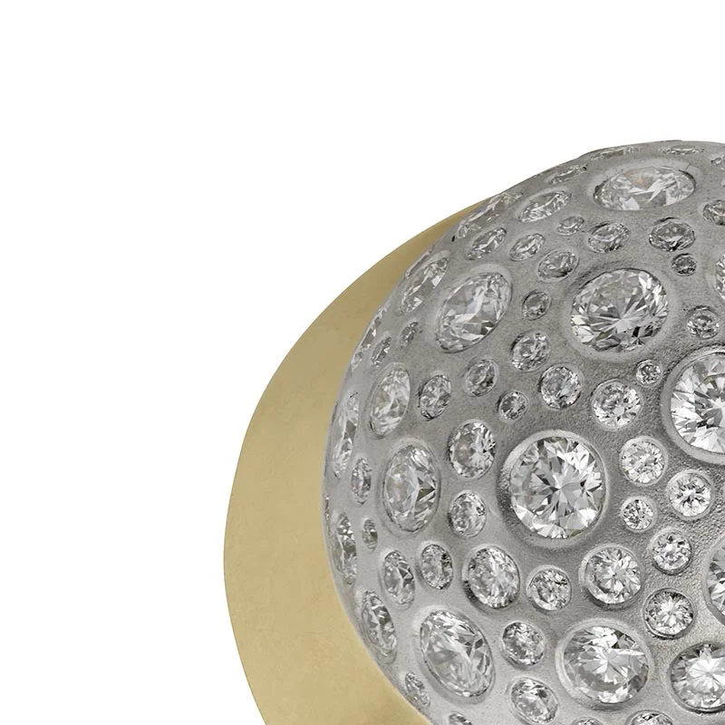 Diamonds of varying size are burnished rather than bead set. Then the metal has been sand blasted for a matte look. The result is a sensuous contrast between the brilliance of the stones and the metal. Perhaps less "bling" and more elegance.